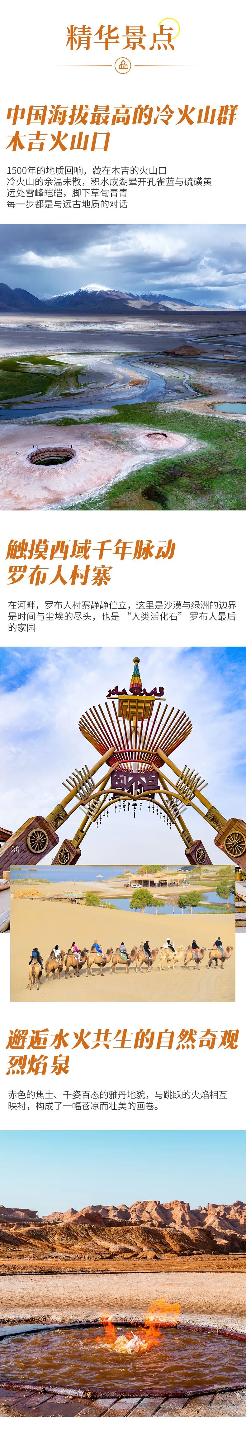 4、门票:罗布人村寨门票+区间车,博斯腾湖大河口景区门票,克孜尔千佛洞门票,烈焰泉门票,温宿大峡谷门票+区间车,白沙湖门票、木吉火山口门票、红其拉甫国门门票;