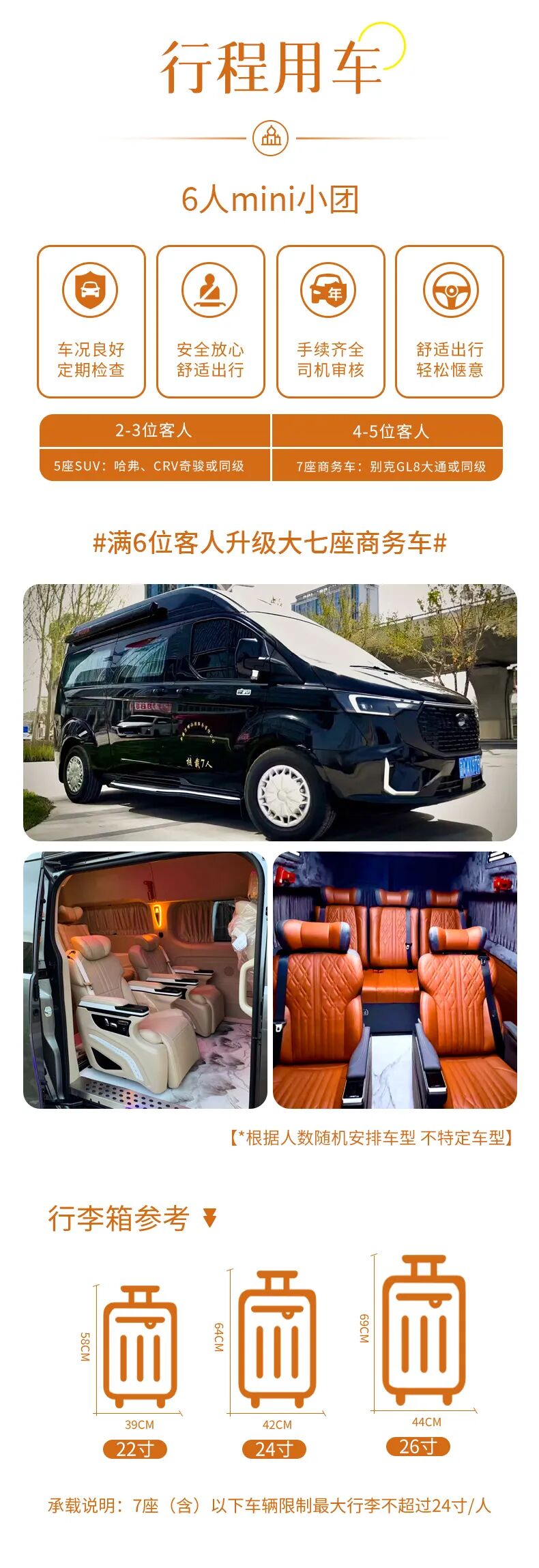 3、用车:2-3人位客人用5座suv,4-5位客人用7座商务车,6位客人用大七座商务车(小团副驾驶及前后座位置需要轮流乘坐,望悉知);