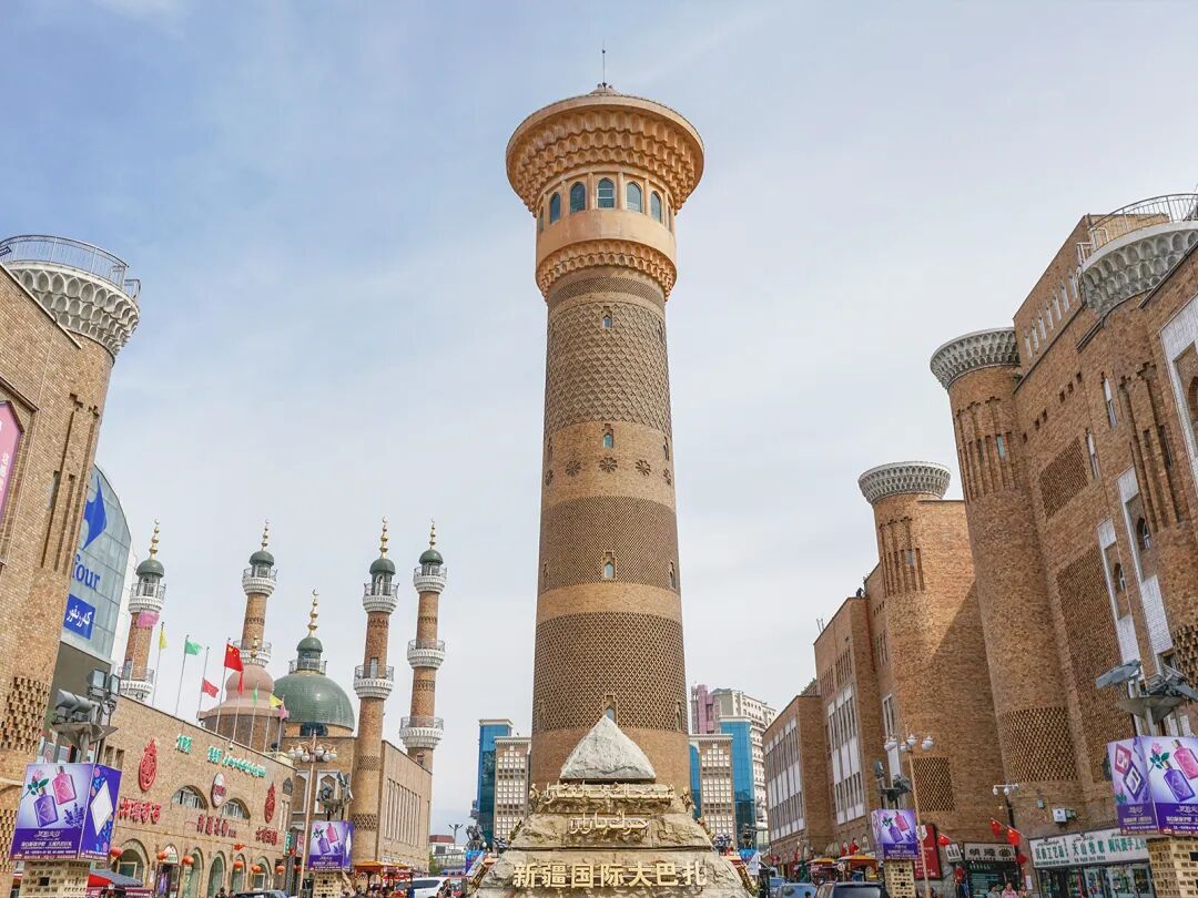 【国际大巴扎】——世界上规模最大的巴扎(巴扎为维吾尔语,意为集市)。具有浓郁的伊斯兰建筑风格,体现了浓郁的西域民族特色和地域文化,这里除了有令人眼花缭乱的商贸市场外,还有美食广场、观光清真寺、80米高的新疆第一观光塔等设施。