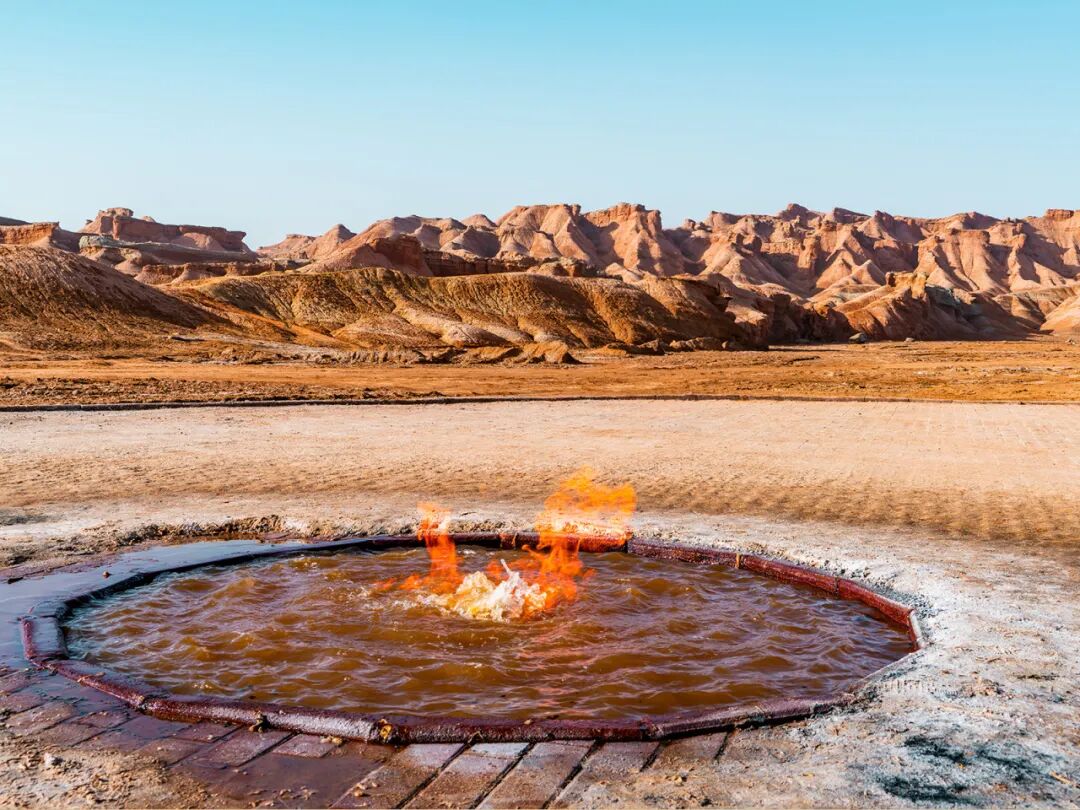 10:30 抵达【烈焰泉景区】,烈焰泉的形成源于地下丰富的天然气资源。天然气通过裂隙上升并与泉水混合,遇到火种便喷出壮观的火焰,造就了泉水与火焰共存的奇景。你可以在这里看到干坑火焰终年不熄、湿坑泉水沸腾翻滚的奇妙画面,感受 “泼水不灭、水火共生” 的震撼。