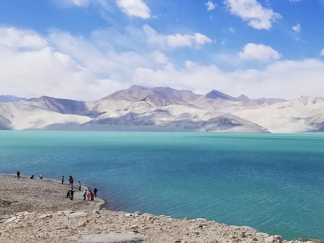 18:00从木吉火山口的幽蓝火景中穿行而出,沿【中巴友谊公路】向帕米尔高原深处前行,当银白色沙山与宝石蓝湖水撞入视野,便抵达了白沙湖北岸的原生秘境。不同于南岸的规整栈道与人群喧嚣,【白沙湖北岸】,北岸连绵的白沙山由天然矿物风化而成,细腻沙质似绸缎般顺滑,风蚀时还会发出轻柔声响,故又称 “响沙山”。