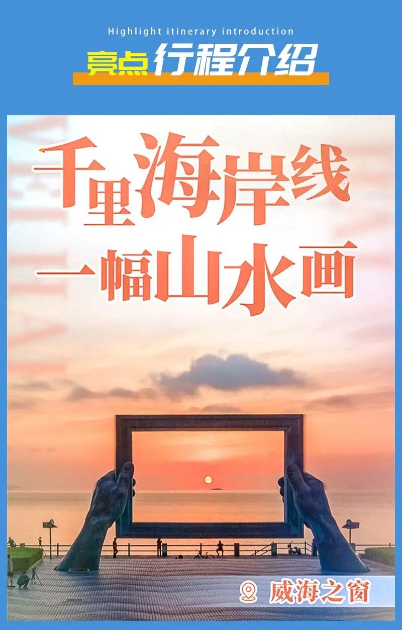 - 下午返回威海市区,继续自由游览威海最美海岸线(可以打卡火炬八街、幸福门、威海之窗等网红景点;还可以游览威海公园、悦海公园、海源公园、海上公园等海岸线公园;傍晚可在小石岛欣赏日落;晚上可以自由前往韩欧乐坊/乐坊夜市品尝美食小吃)。