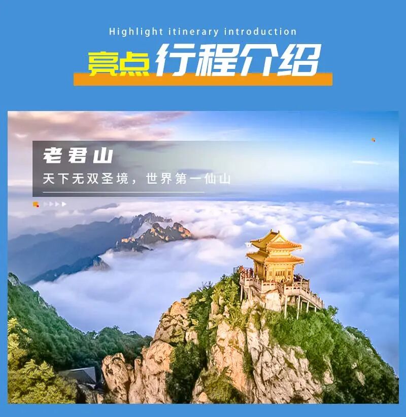 游览顺序:乘坐进口奥地利高速缆车-中灵索道,到达中天门,登518级生财道或者林荫步道,依次观救苦殿、菩萨殿、老君庙、南天门、玉皇顶、悬崖栈道、北国石林、主峰马鬃岭、高空玻璃观景台、舍身崖。之后乘坐索道下山。我们在老君山给大家留足够的时间游览。