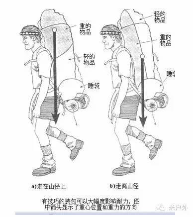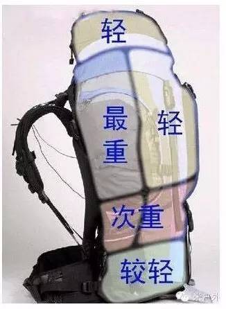 一般重的物品置于顶部,让背包的重心高些,如此背负者于行进过程的腰才能挺直,如果要爬中级难度的山,背包的重心须置低些,让身体能弯曲穿行于林木间。一般的步行,背包装填重心可高些,在贴紧背部的位置。