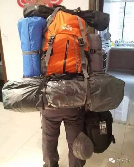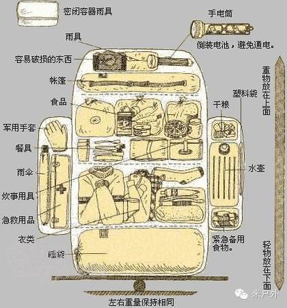 一般人在刚开始接触登山时喜欢称量每一种装备的重量,并根据它们的体积来安排装包的位置,渐渐的培养出一种感觉。装包的关键在于对装备的了解(体积、形状、重量),合理的布局以及最小的个体体积。实现最小的个体体积可以在购买装备时有所选择,也可以在收叠装备时加以控制。比如有人可以用外观只是一个12厘米直径、高13厘米的圆柱体的炊具,在里面却装下了一个气罐和一个炉头,还有百洁布和打火机。这都是在购买装备有所考虑才实现的。下面是老驴友的背包——按从上到下的顺序具体谈一谈如何装包。