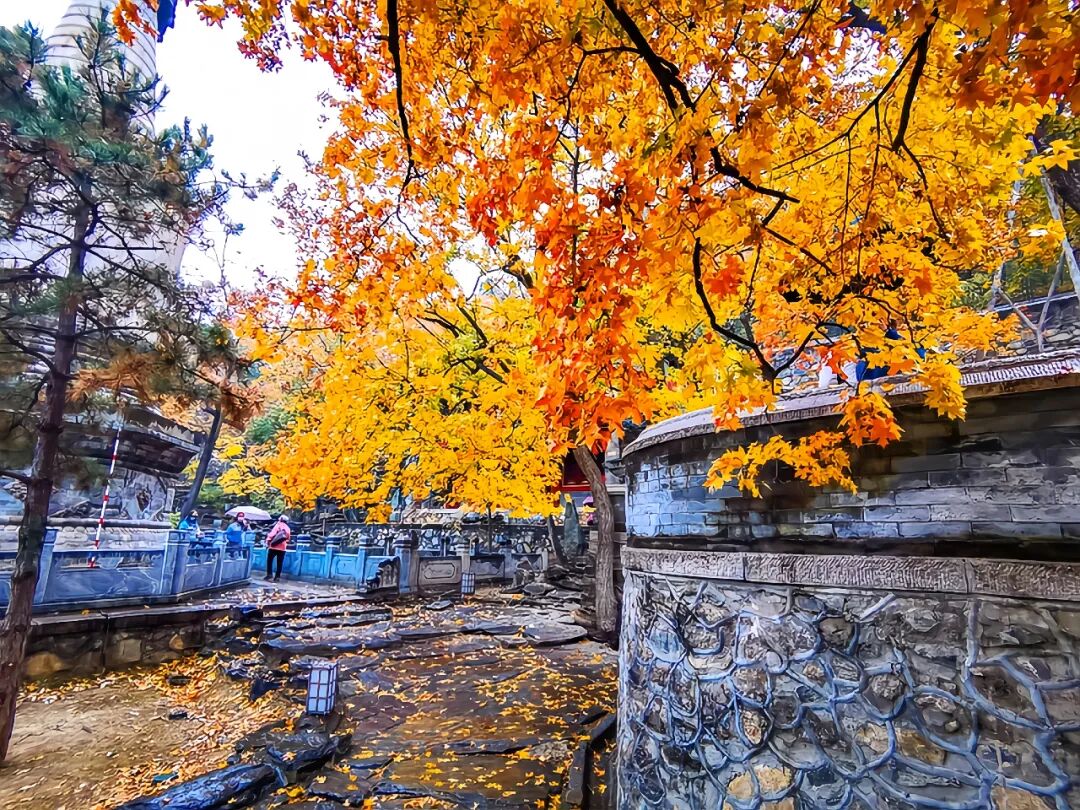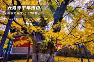 14:00 | 集合前往大觉寺游览。 大觉寺寺内共有古树160株,有1000年的银杏、古娑罗树、松柏等。千年银杏定不会让人失望。满地翻黄,枝头披金,美成了诗。寺后迦陵舍利塔的旁边有两片比较大的红枫,光暖暖的,有风吹来,枫叶落纷纷。大觉寺八绝:古寺兰香、千年银杏、老藤寄柏、鼠李寄柏、灵泉泉水、辽代古碑、松柏抱塔、碧韵清池。 |