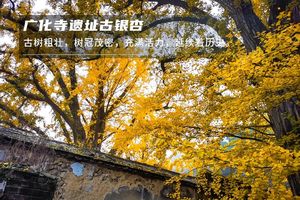 广化寺遗址古银杏。其年代与西山大觉寺相近,同为辽代时期兴建,但其远没有大觉寺幸运,原有的建筑遗迹荡然无存,只留有当时种下的三株古银杏,树龄1100多年,广化寺遗址没有查证到任何文字记载。伟岸探天的银杏树繁多,最高一颗高达28米左右,周长约为6米左右,深藏在此却鲜为人知!
