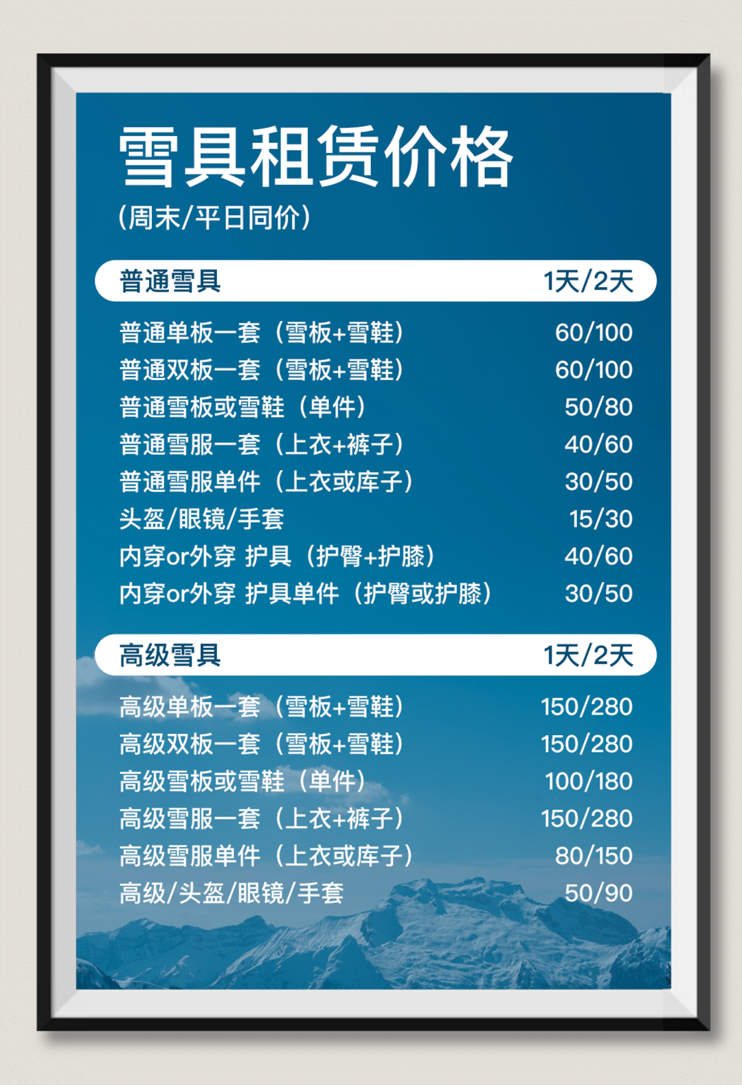 2.雪具租赁:滑雪相关装备均可提供(也可在雪场租赁价格贵)