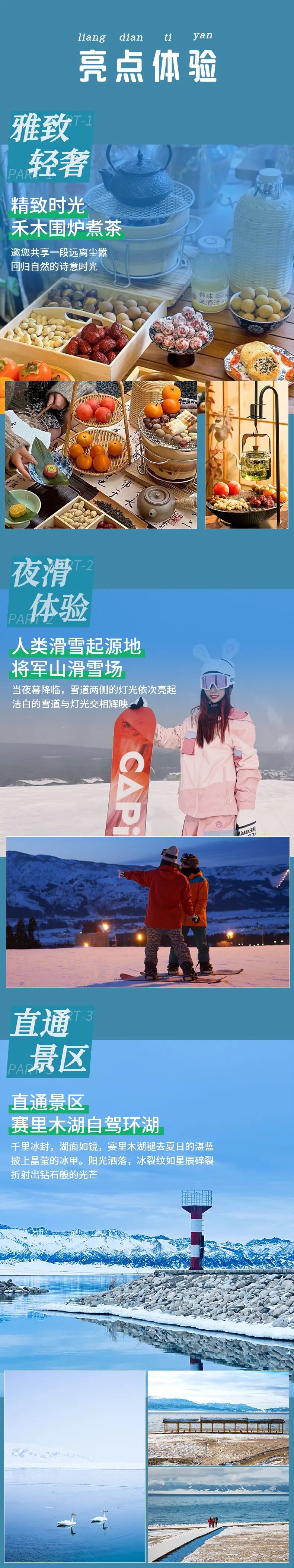 4、门票:将军山滑雪场夜滑(包含雪鞋、雪板、雪杖使用),乌尔禾魔鬼城门票+环保车,喀纳斯禾木冬季通票,赛里木湖自驾票;