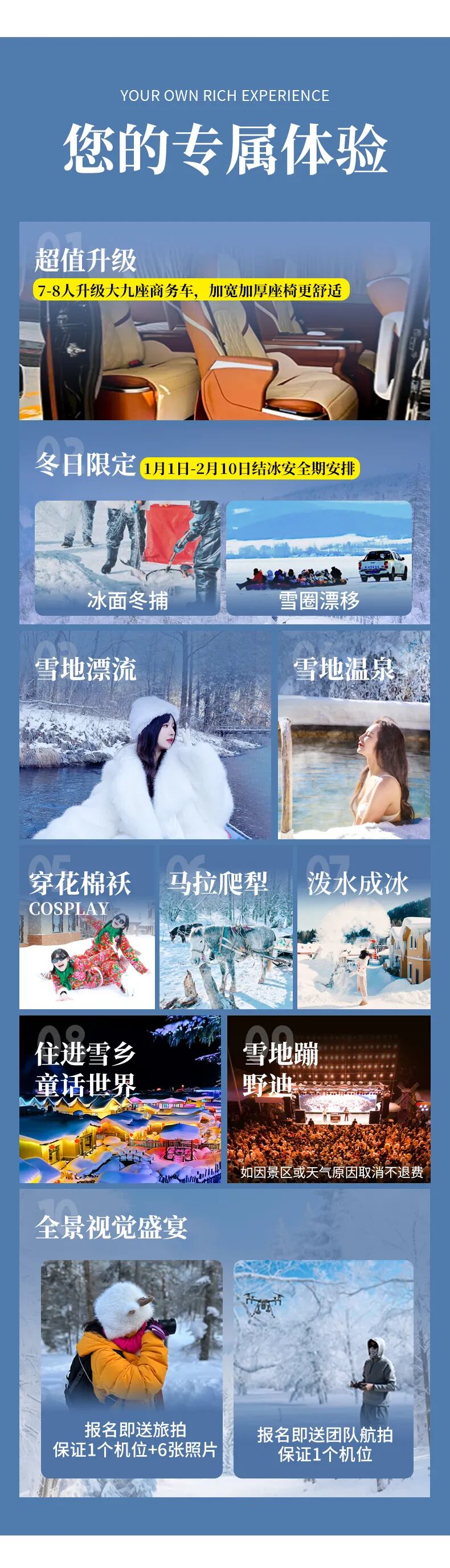 4、赠送冰面雪圈、冰面冬捕(1月1日-2月10日结冰安全期安排,其他时间无法安排不退费用);