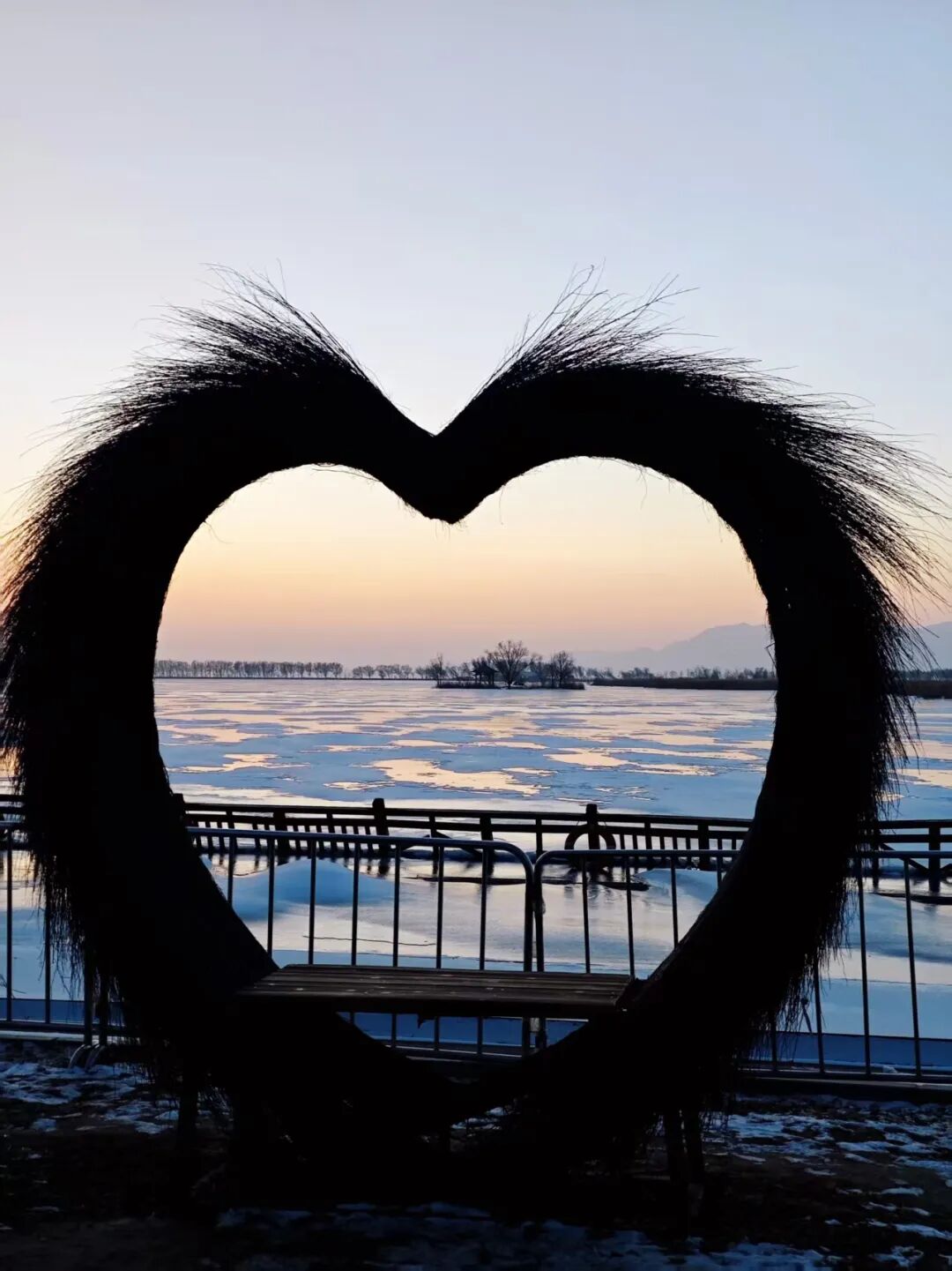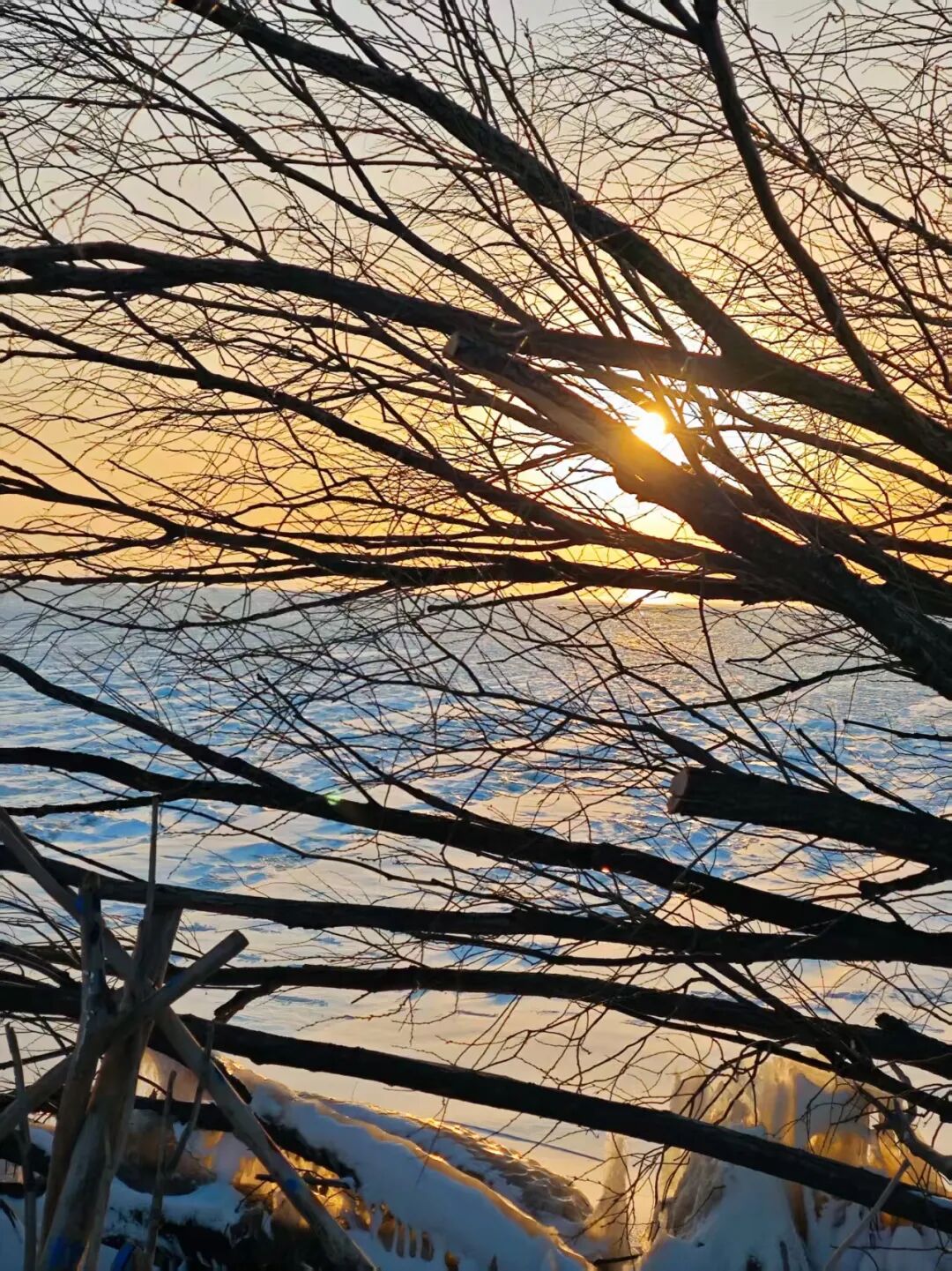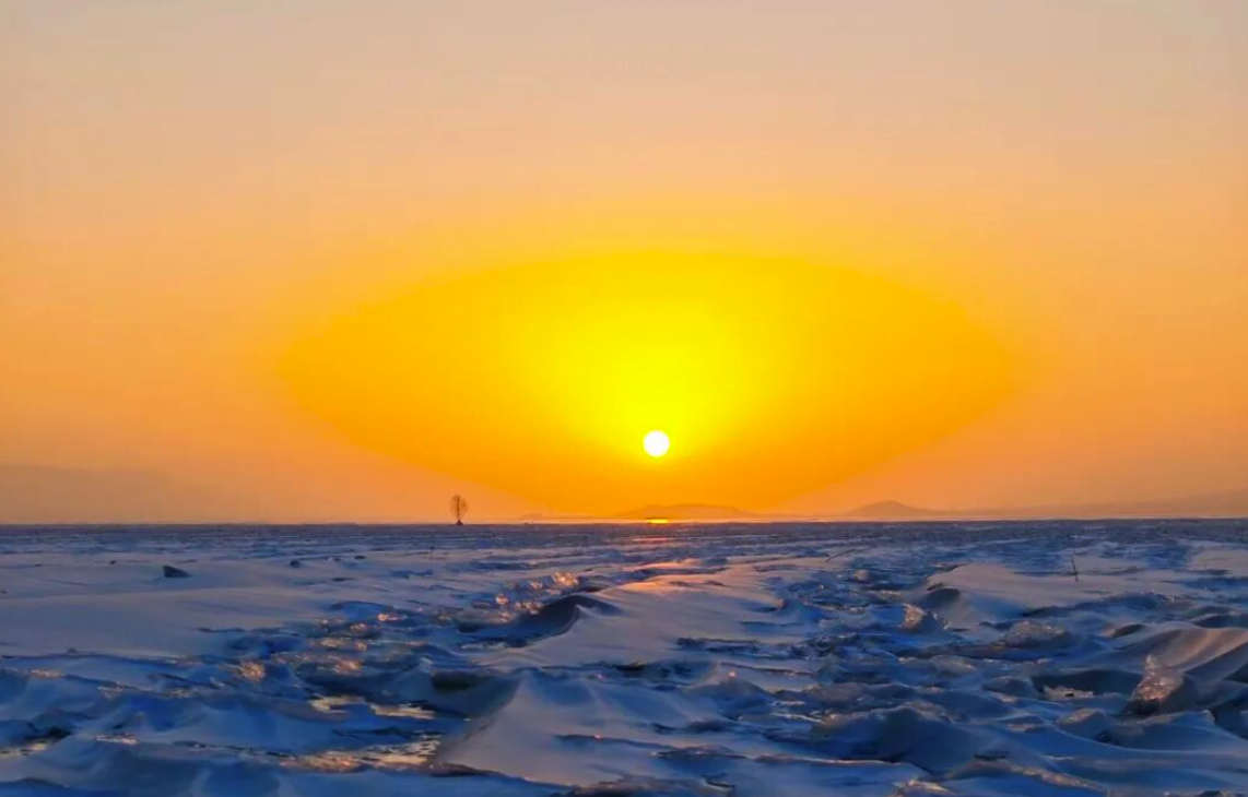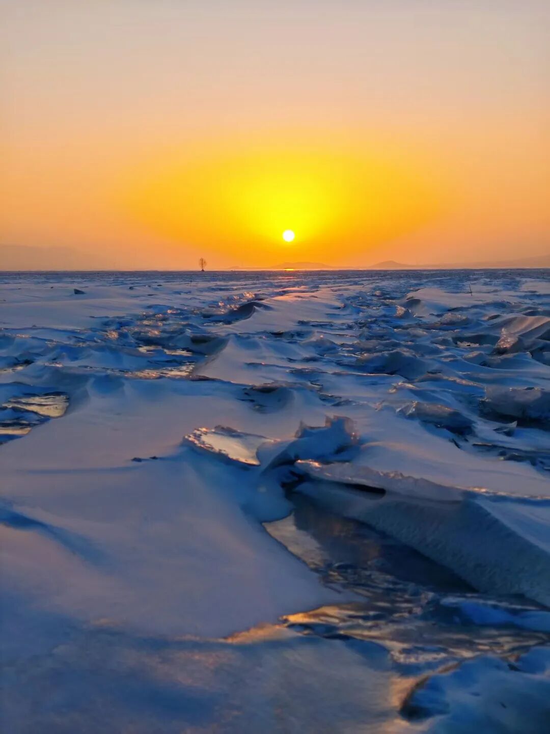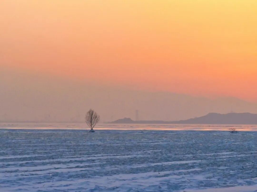 日落时分,晚霞铺染天际,橘红、鎏金与淡紫交织,倾泻在冰湖与芦苇荡上。冰面泛着暖融融的光,芦花被染成金红色,光影流转间,天地皆被温柔包裹。晚风轻拂,落日缓缓沉向远山,余晖渐淡,只剩暮色与湿地相拥,静谧又治愈,尽显冬日湿地的独特诗意 |