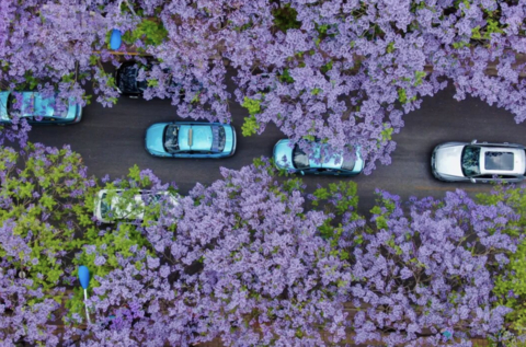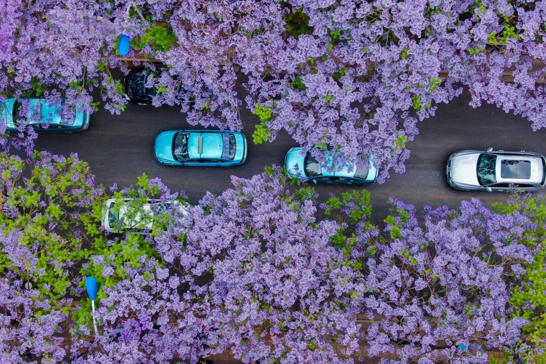 15:00 前往【航天北路蓝花楹】,每到花期,这里便成为紫色的海洋。道路两旁高大的蓝花楹树,花朵密集地绽放,把整条街道装点得如梦如幻。微风吹过,蓝紫色的花瓣飘落,宛如一场浪漫的花雨。漫步其间,拍照留念,感受这春日限定的美景。