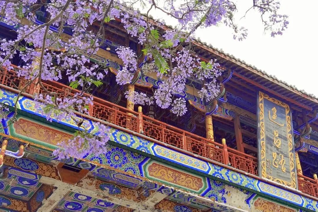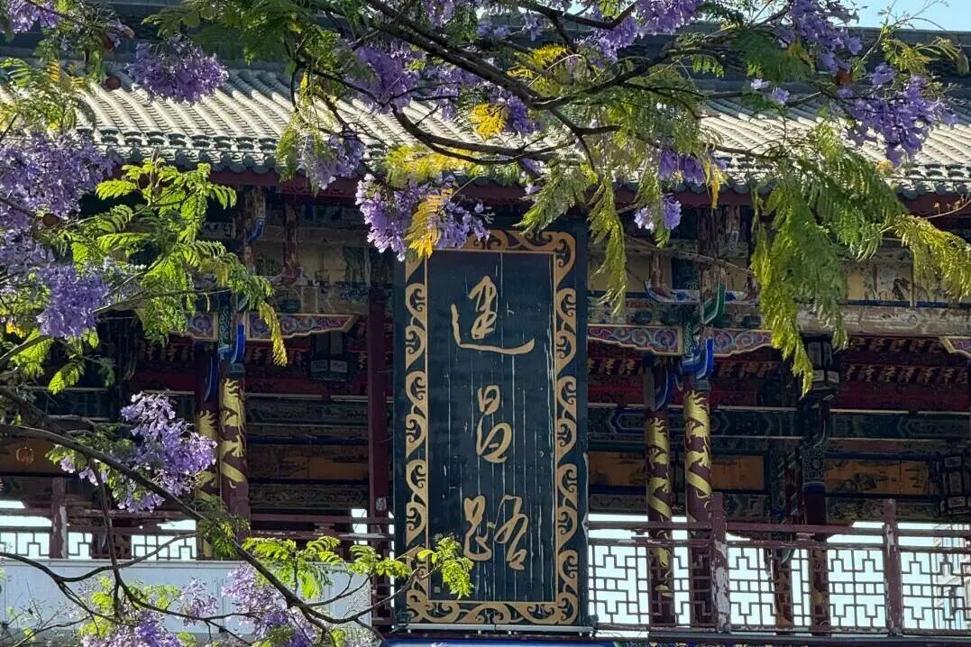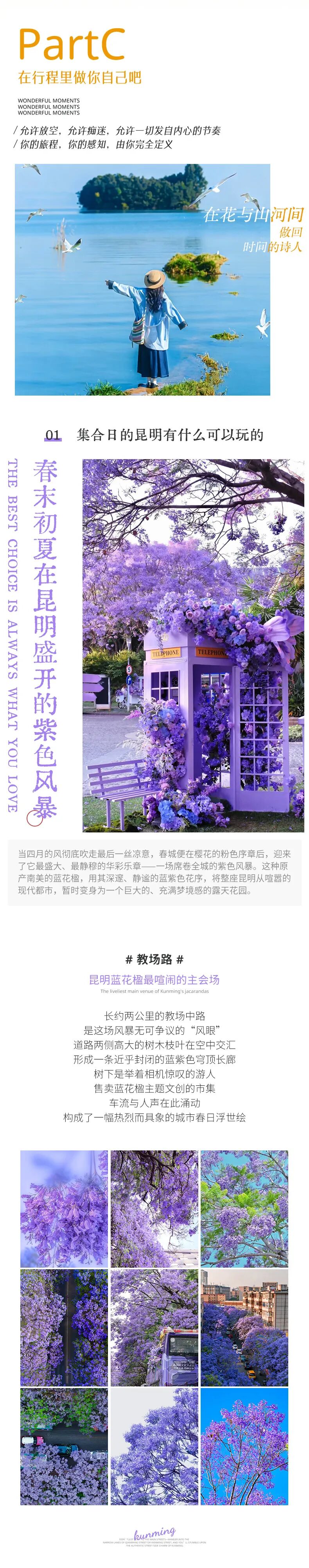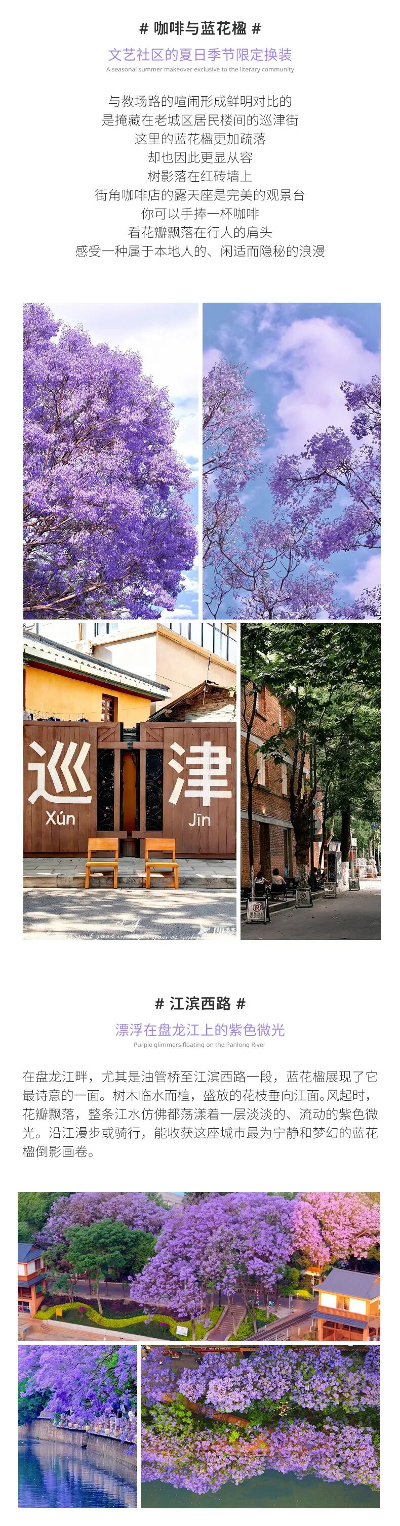 08:30 首先前往此行花季第一站—【教场路蓝花楹】,在昆明的教场路,藏着一场盛大的紫色浪漫。每年花期,蓝花楹树如同被打翻了颜料瓶,满树蓝紫色的花朵肆意舒展 ,挨挨挤挤地凑在一起。微风拂过,花枝轻颤,花瓣纷纷扬扬飘落,为大地铺上一层梦幻的花毯。无论是漫步其中,还是驻足观赏,都能深切感受到这份独属于教场路蓝花楹的春日限定美好,让人流连忘返。