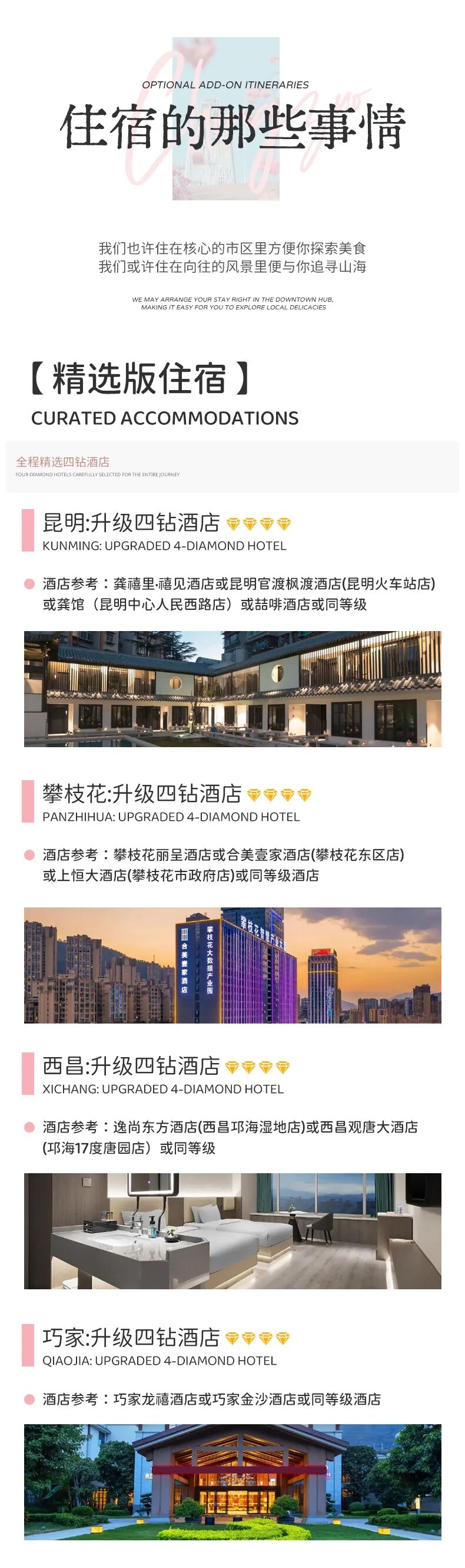 1、住宿:昆明1晚四钻酒店(参考:龚禧里·禧见酒店(昆明火车站大树营地铁站店)或枫渡酒店(昆明站官渡万象城店)或同等级酒店),攀枝花1晚四钻酒店(参考:攀枝花丽呈酒店或合美壹家酒店(攀枝花东区店)或上恒大酒店(攀枝花市政府店)或同等级酒店),西昌2晚四钻酒店(参考:逸尚东方酒店(西昌邛海湿地店)或西昌观唐大酒店(邛海17度唐园店)或同等级酒店),巧家1晚四钻酒店(参考:巧家龙禧酒店或巧家金沙酒店或同等级酒店);