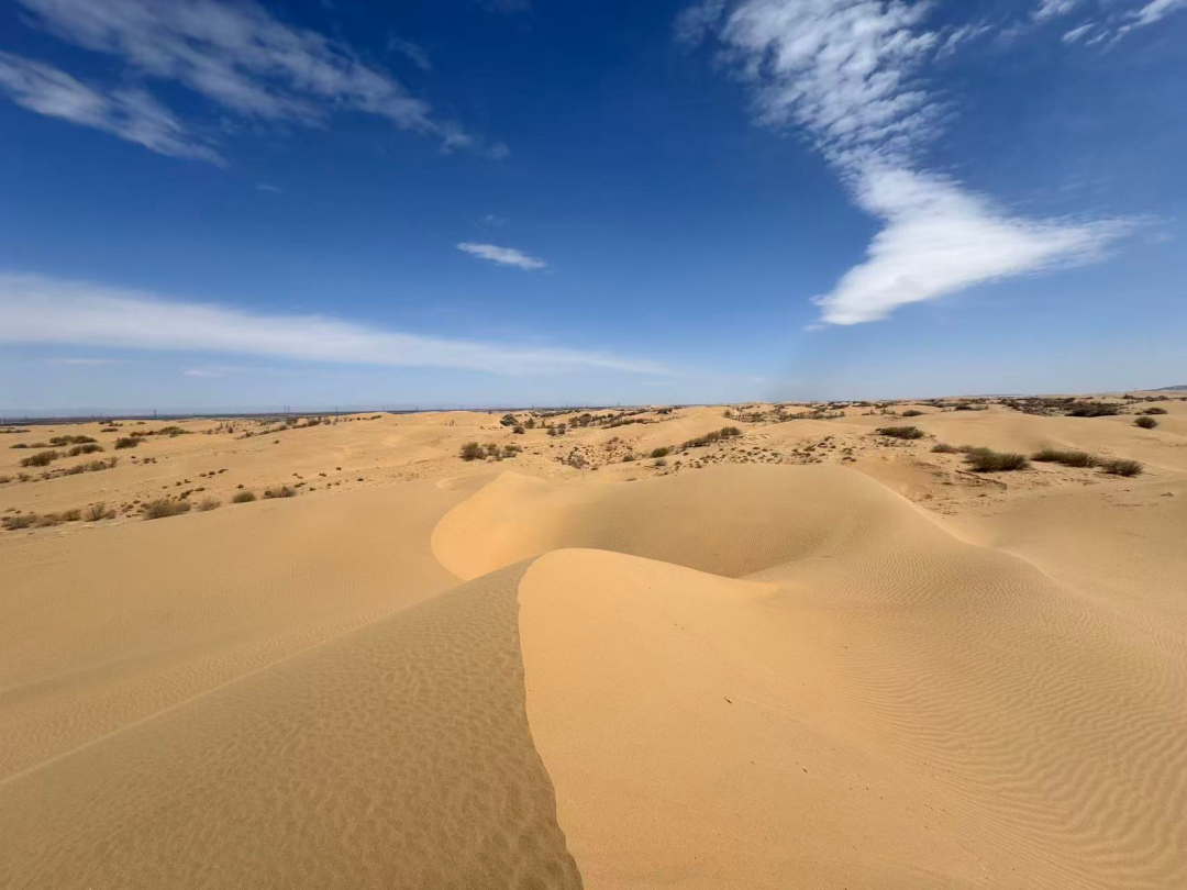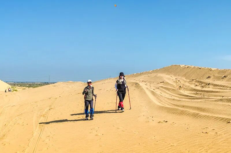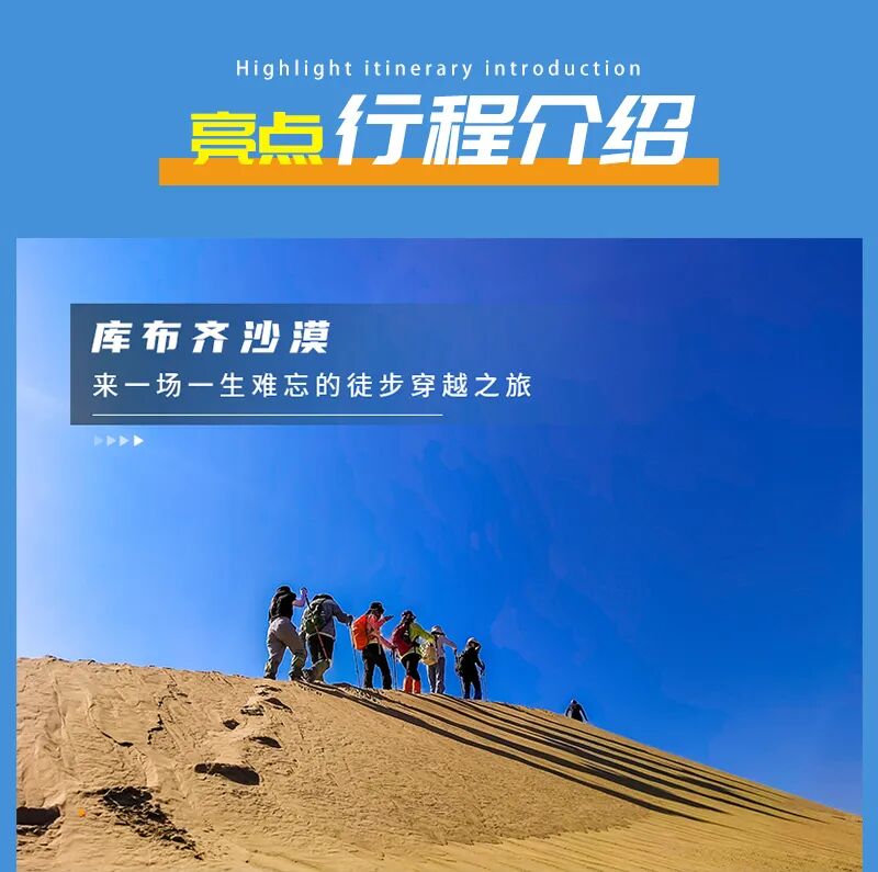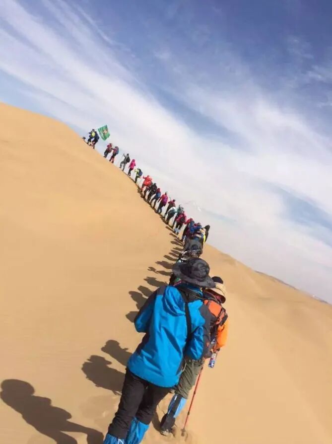 - 早上继续出发,前往中国第七大沙漠库布齐沙漠徒步。领队开始会给大家讲解沙漠徒步注意事项,到达沙漠边缘,稍适休整,之后开始第一天的沙漠穿越,今天要经过很多种地貌,沙漠行走注意补充营养、水分。在沙山中行走要求队员有更好毅力与耐力,跟紧领队的步伐。途中需翻越几座比较高沙山,中途在沙漠中的绿洲边休息、路餐,全程徒步约12公里,爬升约150米(如体力不好,也可以前往附近沙漠地质公园游览骑骆驼、玩沙地摩托等)(注:每人需准备2-3升水,午餐1份)