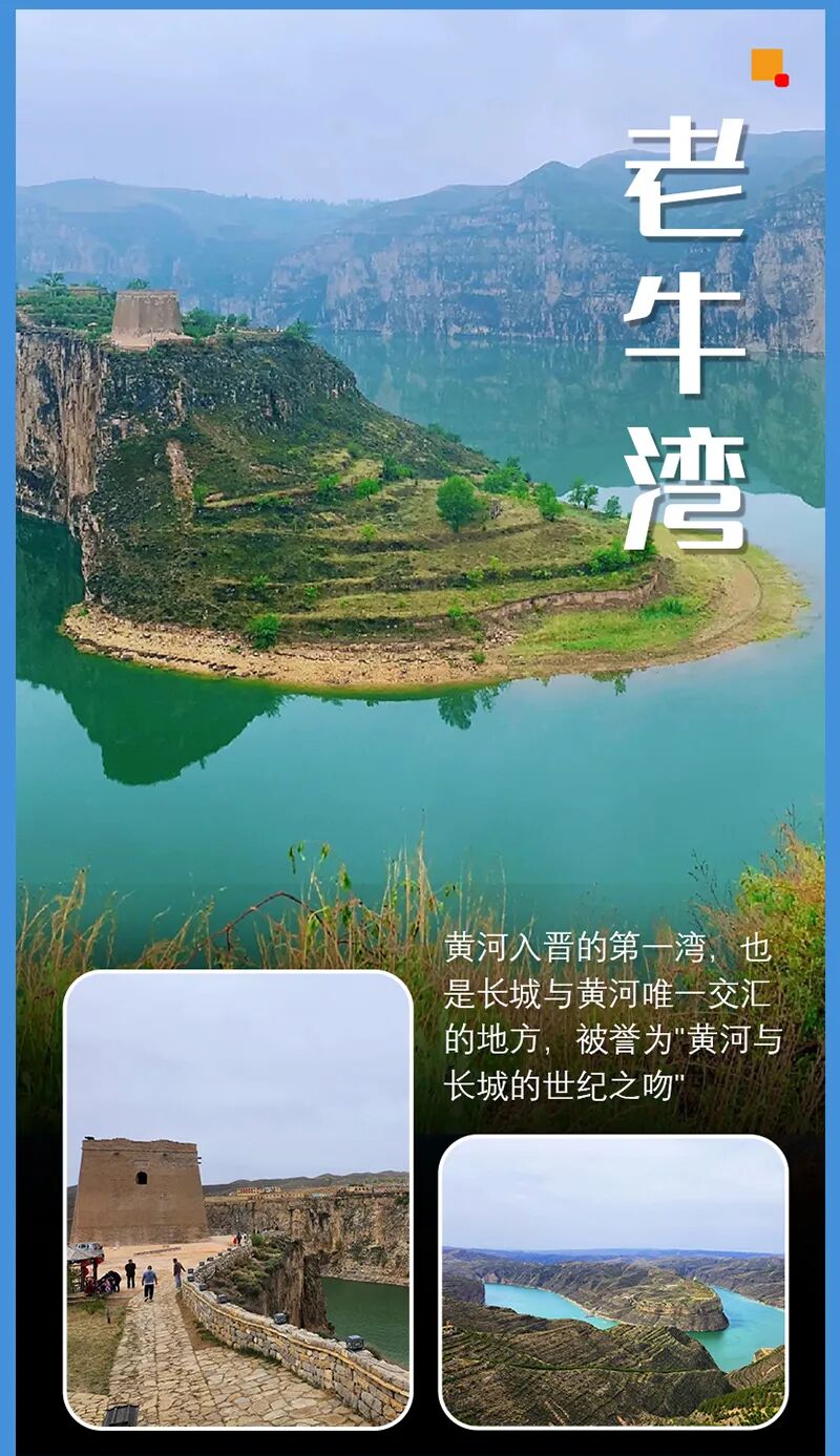 - 之后游览内蒙古老牛湾,这里是黄河与长城交汇的奇迹之地,以其壮美的自然景观和深厚的历史底蕴著称。这里,黄河蜿蜒流转,长城蜿蜒盘旋,共同绘制出一幅动人的山河画卷。