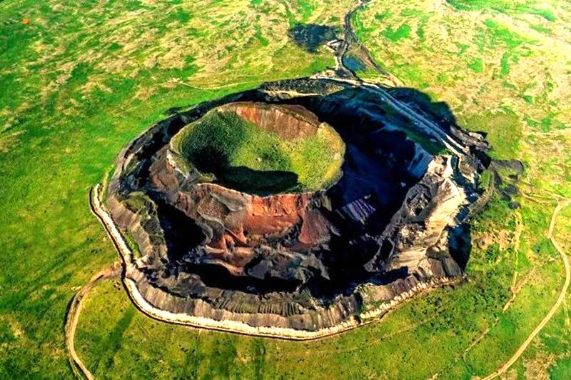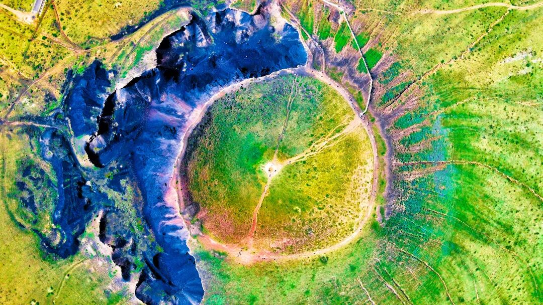 乌兰哈达火山群,绵延近千公里,形成于12万年前的第四纪晚期,直到2012年才被国内外火山学界所知。这是一片尚未被大肆炒作、得以保持清净的火山,被《美国国家地理》杂志誉为“中国醉美火山群”。我们可以爬上火山口,去一探究竟!这里喷发的炼丹炉火山,是我们主要参观的地方。在6号和4号火山的侧面,我们还能看到当年火山喷发后留下的凝结的岩浆,和碳的颜色相似,但是由于有硫磺等物质,表面会泛着七彩的颜色,非常好看,我们在这里尽情游玩、拍照。