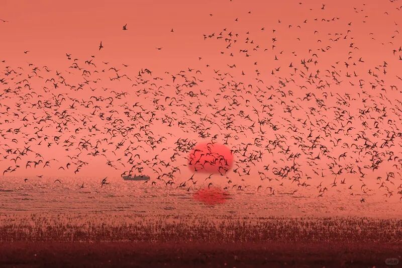 大辽河口湿地是东北亚内陆与环西太平洋鸟类迁徙的关键中转站,为国际八大候鸟通道之一。每年 4 月上旬至 5 月上旬是鸻鹬类候鸟北迁高峰期,每日有数万只水鸟云集,形成震撼 “鸟浪” 奇观。核心观鸟点为鸟浪广场(西市区观海路 15 号),设有木质廊桥与观鸟台,视野开阔。涨潮前后两小时为最佳观赏时段,候鸟随潮起潮落振翅齐飞,如乌云翻卷、波浪荡漾,与夕阳、滩涂构成绝美画卷。能看到万鸟齐飞、鸟浪翻滚的的震撼场景。