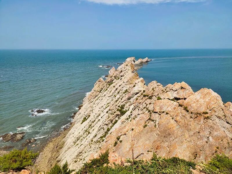 4.排石礁群(约 2 小时):一排礁石呈扇面深入海中,延伸超 1 公里,形如哥斯拉尾巴或巨龙鳞片,退潮时显露壮观 。驼山石壁,高约 20 米,岩层叠压似经卷摊开,夕阳下泛金光。象形石与海蚀洞包含“石猴观潮”、“渔翁出海”等奇石,部分崖壁有上下贯通的海蚀洞,潮水涌动时景色独特 这里也是观看日落和夕阳的好地方。这里也是国家地理推荐的大连三个地点之一,另外两个是金石滩和长海县。
