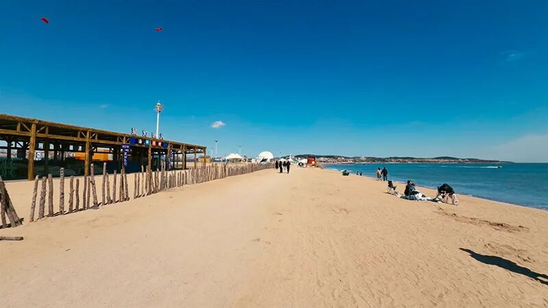 2、银沙滩,(约 1 小时)一个比星海广场人少很多的地方,超级出片:网红S弯公路(小镰仓风、礁石洞、跨海大桥同框),鹅卵沙滩、海水清澈 海浪声音好听,银沙滩紧挨着跨海大桥。