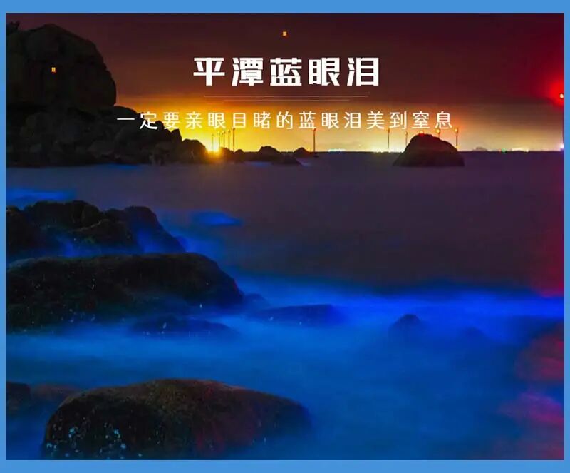 - 晚上 自由结伴打车前往邂逅蓝眼泪,追泪建议:龙王头/东美村/坛南湾/长江澳等(注:蓝眼泪属于概率现象,有很大可能不出现,出现的时候有可能堵车,需保持好平常心);或者前往人民广场/原汽车站的平潭夜市品尝美食。