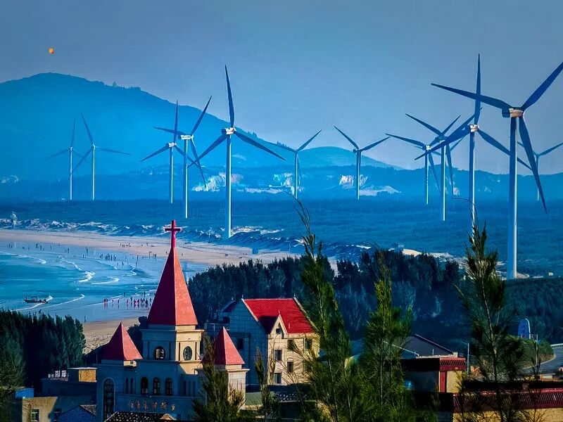 - 上午 壮观的长江澳风车田绵长的沙滩上伫立着巨大的风车,这里的沙滩是平潭三大海滨沙滩之一,可在广阔无垠的沙滩上自由奔跑!