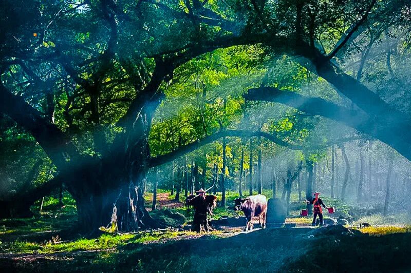 - 下午 前往杨家溪榕枫公园,古榕树虬枝伸展,遮天蔽日。古榕树下我们先安排老农牵牛拍摄:在古榕树下布置烟雾场景,阳光透过榕树间隙照射下来形成丁达尔光线,此时畲族阿婆挑担子,阿公牵牛配合拍摄;随后安排村姑赶鹅拍摄,这是杨家溪榕树下的新晋宠儿,村姑模样打扮的妇女赶着一群白鹅于榕树下觅食,憨态可掬的鹅群很是讨喜。