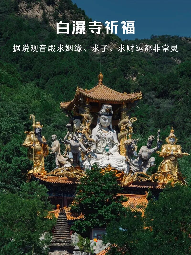 白瀑寺必游五大景点: ⑴京城最玄幻网红拍照地——云雷阁 ⑵红遍京城车友圈祈福地——车神殿 ⑶白瀑寺制高点——观音洞 ⑷白瀑寺900多年的辽代古塔——圆正法师塔 ⑸白瀑寺魔幻建筑——四面观音像 |