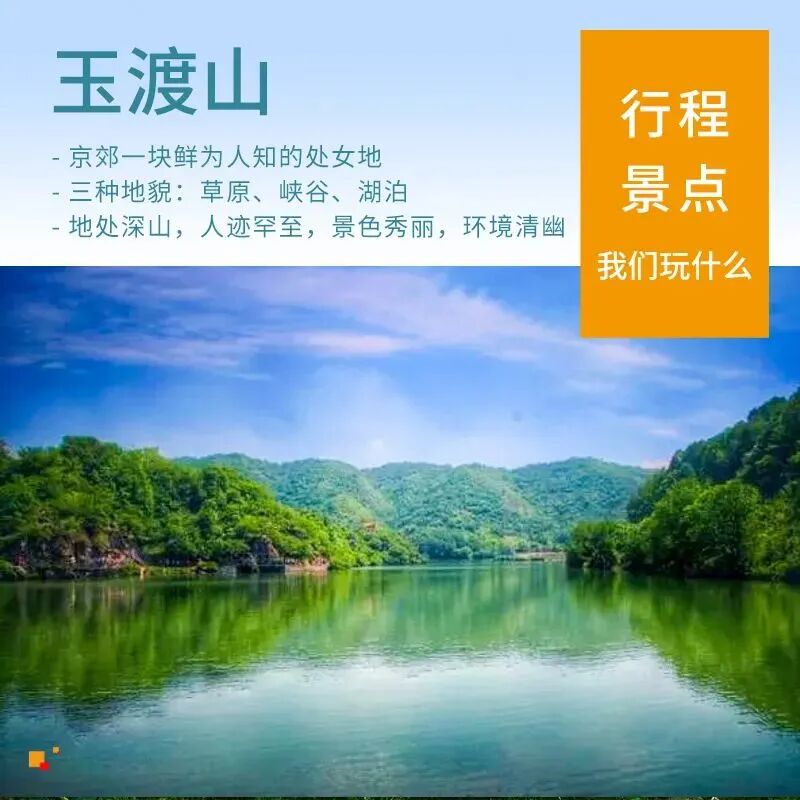 到达玉渡山景区,大巴车一直开到山顶,我们将群山踩在脚下,双手触摸白云。进入景区后,大家可以结伴自由玩耍。 •在湖畔边:最适合拍照赏景,这里有喊泉,各种野花,呼吸最清新空气; •在大草甸上:最适合各种嘻戏、草地打滚、放风筝、玩游戏,你可带上垫子准备些零食,享受云端午餐; •在峡谷里:您可在溪边尽情戏水,捉小鱼,您也可以挑战全程溯溪,来一次野外体验; •爬玉渡山:体力好的伙伴,不防来个玉渡山小环线,锻炼身体,美景更是在人迹罕至的地方; •环湖游:绕忘忧湖来个360度无死角环湖徒步,移步换景,美景一路相随; |